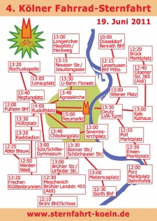 Die 4. Kölner Fahrrad Sternfahrt findet am 19. Juni 2011 unter dem Motto Köln lebenswert gestalten - dem Fahrrad Raum geben statt. 10 Routen mit 34 Treffpunkten starten in und um Köln in Altstadt-Süd, Brück, Brühl, Düsseldorf, Ehrenfeld, Frechen, Longerich, Porz, Pulheim, Sülz und Sürth. Sie führen zum Rudolfplatz, wo um 14 Uhr eine Rundfahrt zum Neumarkt beginnt. Dort findet eine Abschlußkundgebung mit Live-Musik und Ansprachen statt.