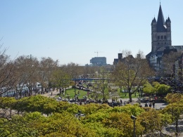 Der Fischmarkt liegt in der Mitte der Frankenwerft auf der Höhe der romanischen Kirche Groß St. Martin, er bildet die Öffnung vom Martinsviertel zum Rhein.